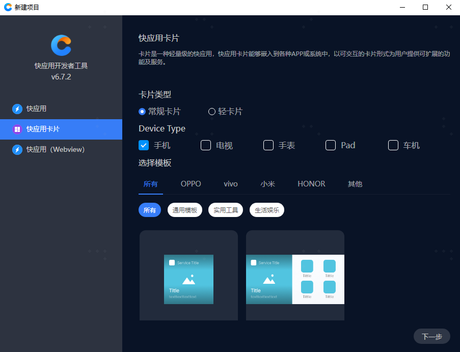 2、选择快应用卡片,然后选择对应厂商的卡片模板,点击下一步
