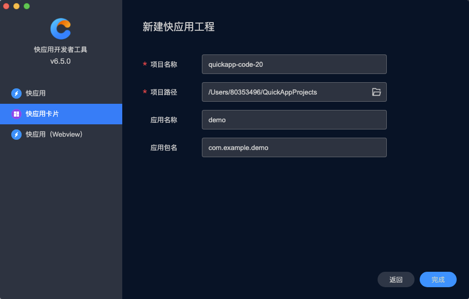 3、新建快应用工程界面,可以对项目名称、项目路径、应用名称、应用包名进行编辑。
